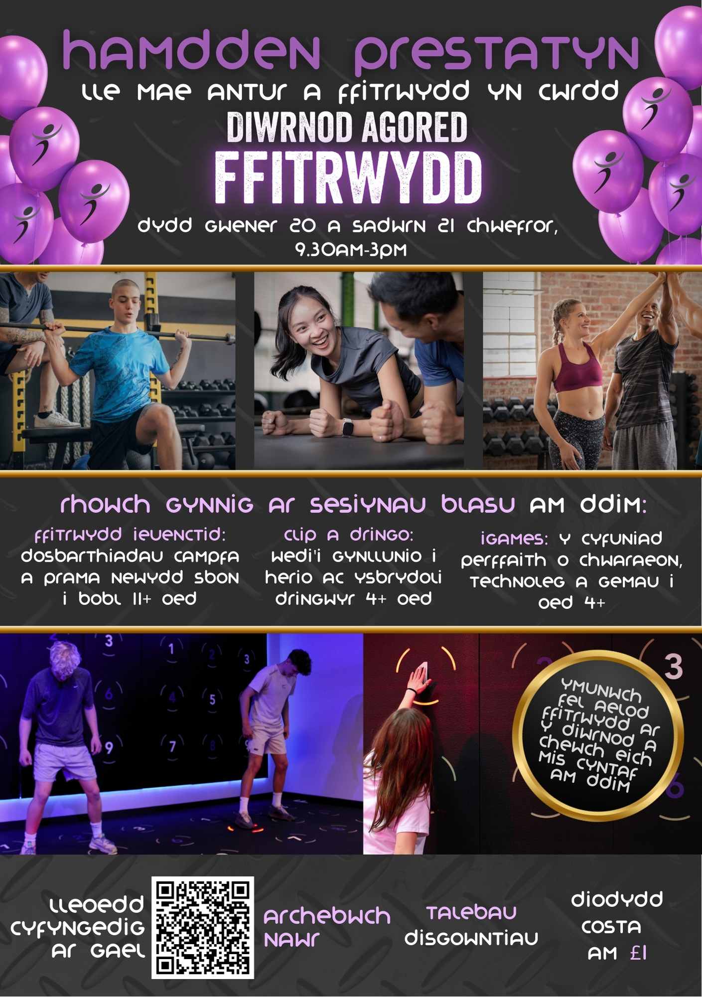 Ar draws y ddau ddiwrnod, bydd cyfle i’r rheiny sydd â diddordeb mewn cadw’n heini i gymryd rhan mewn amrywiaeth o sesiynau blasu ffitrwydd, gan gynnwys cyflwyniad i’r gampfa newydd wych, a fydd yn cynnwys sesiynau ar gyfer pobl ifanc rhwng 11 a 17 oed yn unig.